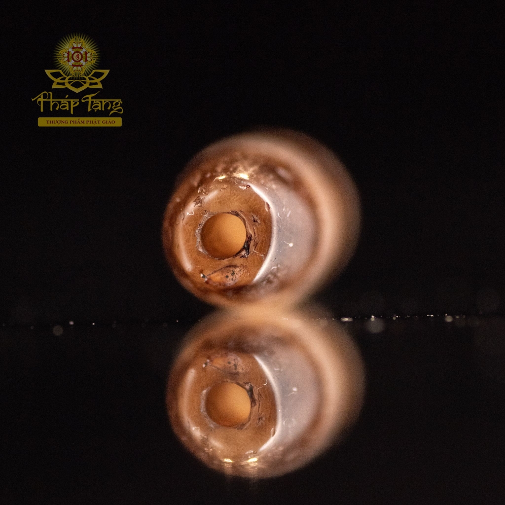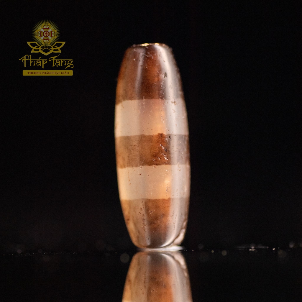 Viên Chung Dzi này là một pháp bảo độc bản (ĐB) vô cùng quý hiếm, hội tụ hai giá trị đắt giá: "Chung Dzi" (Dzi họa tiết) và "Mã Não Xưa Xuyên Thấu". Được sưu tầm từ Tây Tạng (Tibet), pháp bảo mang hình dáng trống (barrel) cổ điển, nổi bật với chất đá mã não trong đến mức xuyên thấu, cho phép ánh sáng đi qua và làm lộ rõ các dải vân màu nâu sẫm trầm mặc xen kẽ với các dải màu trắng kem tinh khiết.