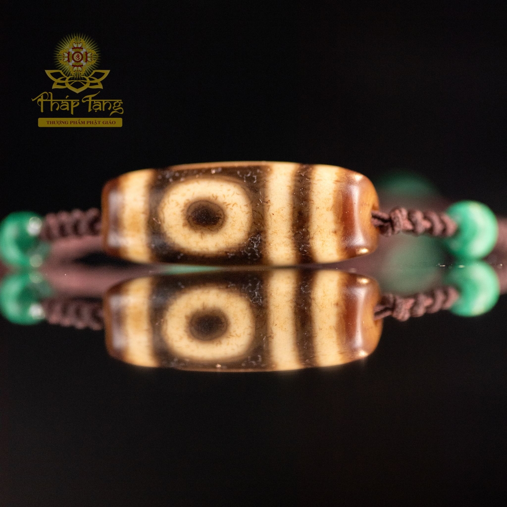 Viên Dzi 2 Mắt Dáng Trụ Tròn Truyền Thừa này là một pháp bảo độc bản và vô cùng hiếm có. Với kích thước 3.4CM, pháp bảo này nổi bật với dáng trụ tròn cổ điển, chất đá Agate màu ngà (Ivory) đã lên dầu bóng mượt. Điểm đặc biệt nhất là "vết cắt truyền thừa" ở phần đầu - một dấu ấn tâm linh của người Tây Tạng, biểu thị năng lượng đã được tích lũy và truyền qua nhiều đời.