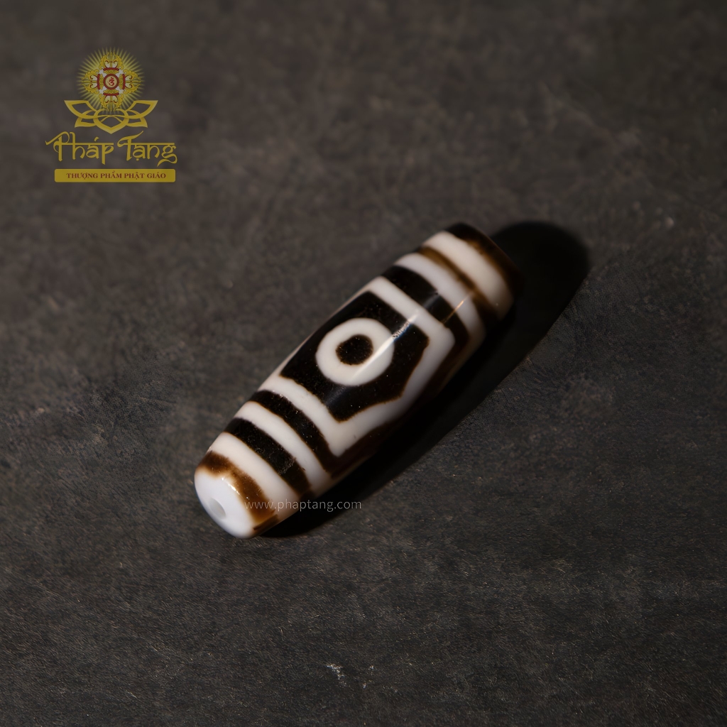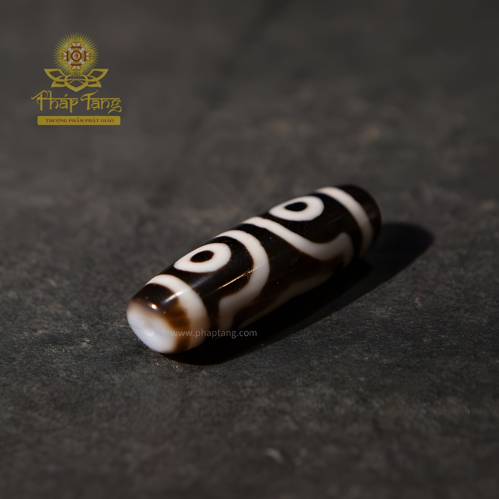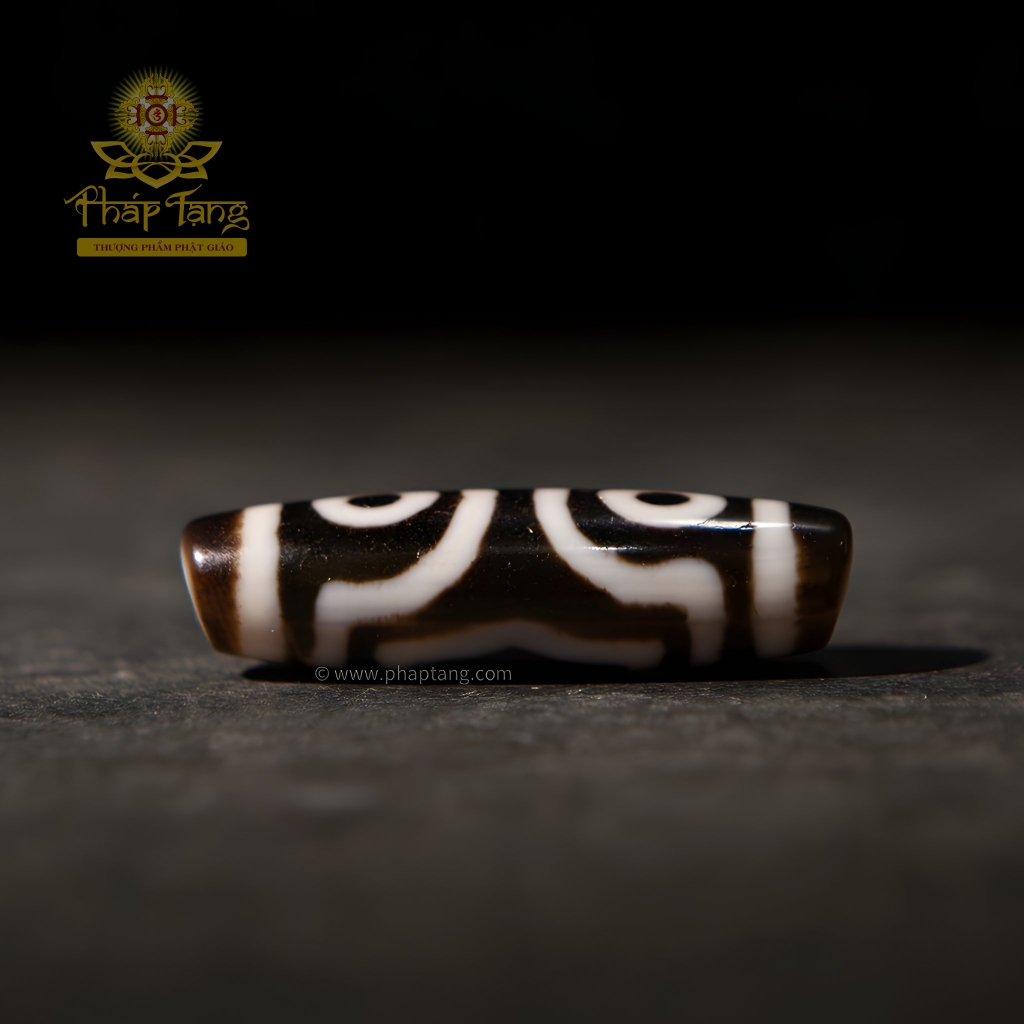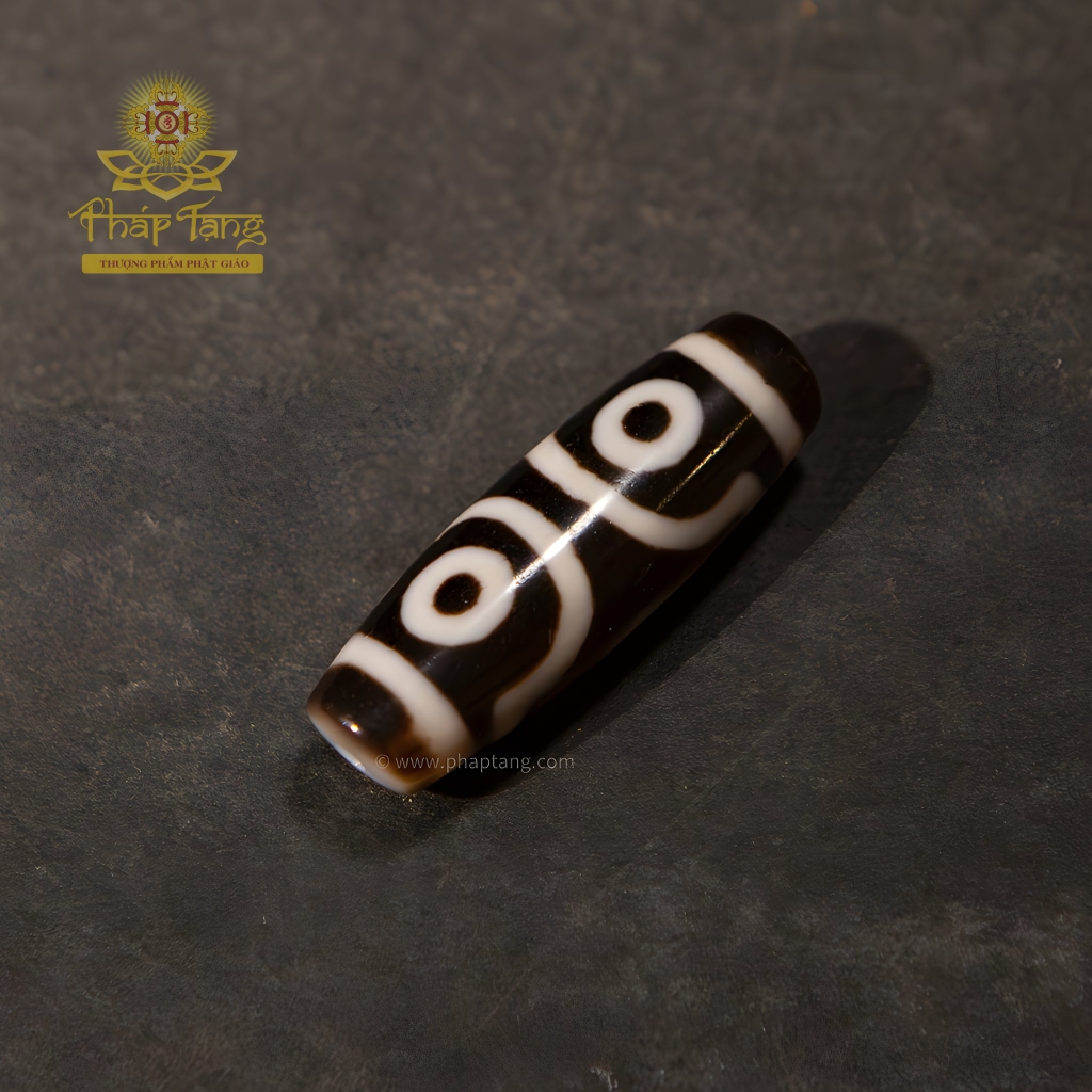 Đây không phải là viên Dzi 3 mắt thông thường. Ba con mắt mang diễn giải tâm linh quý giá: 2 mắt tượng trưng cho đôi mắt từ bi của Hoàng Thần Tài (Dzambhala) và mắt thứ 3 tượng trưng cho chính miệng Ngài – nơi ban phát phúc lành, tài bảo và sự thịnh vượng. Sở hữu pháp bảo này không chỉ là lời cầu nguyện cho ba phước báu lớn (tài lộc, hạnh phúc, trường thọ), mà còn là vật hộ mệnh cho hành giả trên con đường chuyển hóa Tam Độc (Tham, Sân, Si) thành Tam Học (Giới, Định, Tuệ).