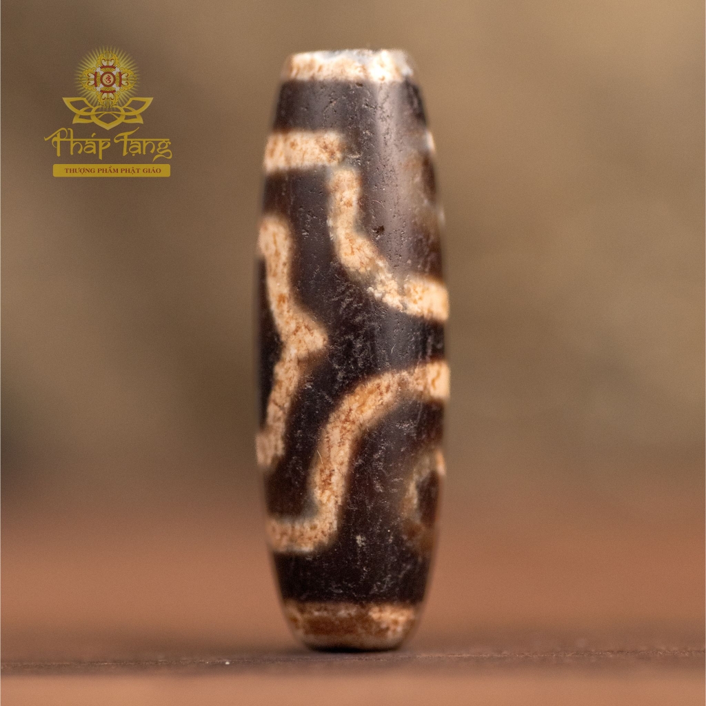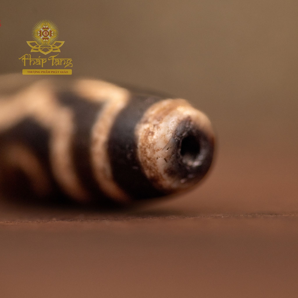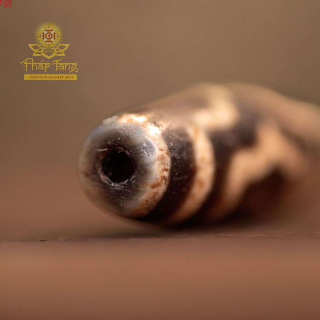 Một pháp bảo độc bản (ĐB) với năng lượng tâm linh vô cùng mạnh mẽ, viên Dzi Thiên Châu Hành Giả 3 Mắt (36.7mm) này là một tuyệt tác từ Tây Tạng (Tibet). Pháp bảo nổi bật với chất đá mã não "thân đen" cổ kính, mang màu đen tuyền uy nghiêm (hành Thủy), tương phản hoàn hảo với hoa văn màu trắng ngà. Bề mặt đá lộ rõ những dấu hiệu phong hóa và các chấm chu sa (cinnabar dots) quý hiếm, minh chứng cho một viên Dzi Cổ (Old Dzi) đã tích tụ năng lượng qua nhiều năm tháng.