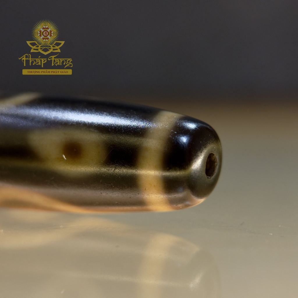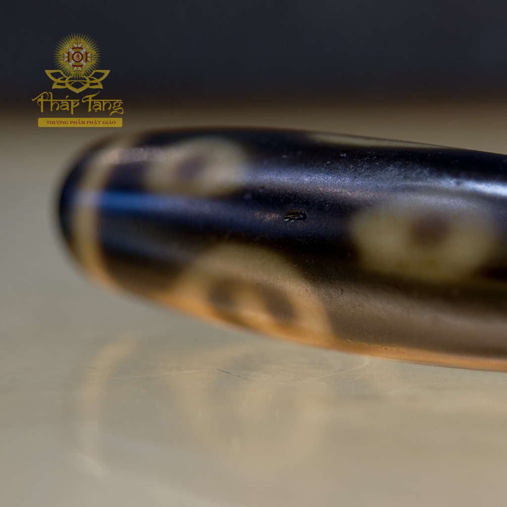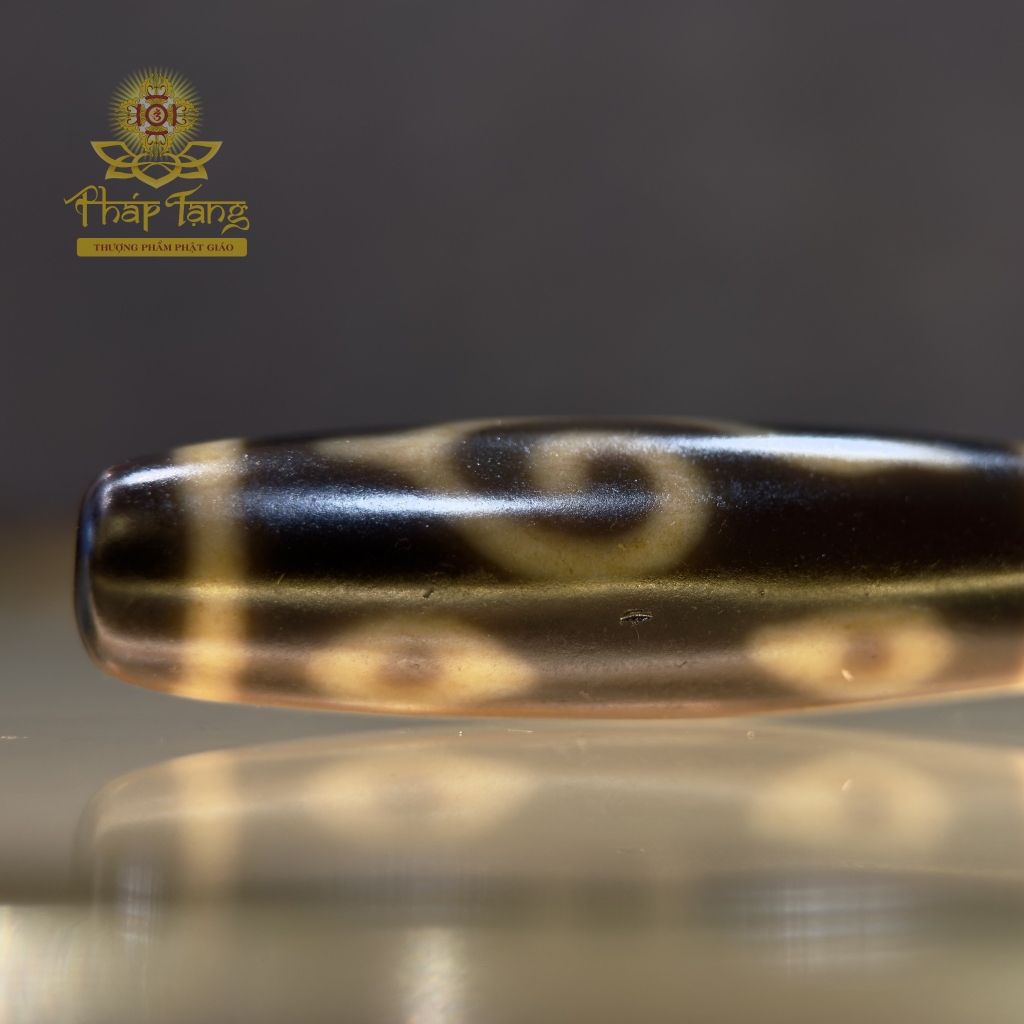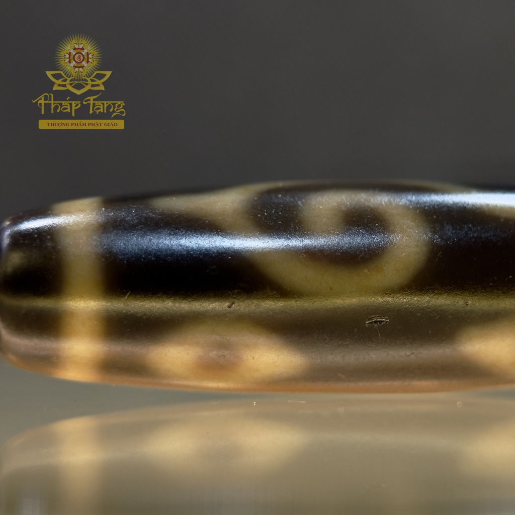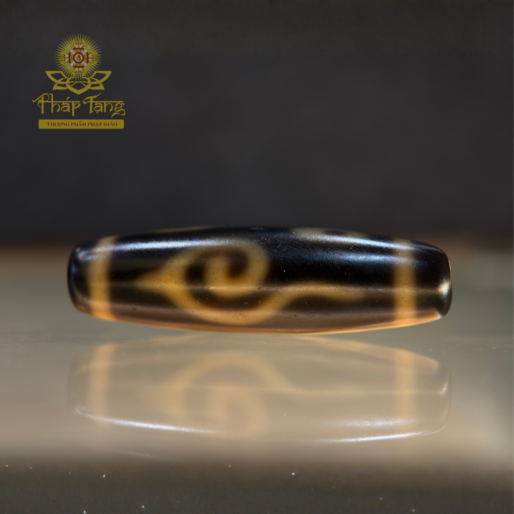Ngay từ cái nhìn đầu tiên, pháp bảo này đã toát lên một năng lượng khác biệt. Không giống Dzi 1 mắt tròn thông thường, hoa văn "Thiên Nhãn" trên viên Dzi này được cách điệu tinh xảo, tựa như một vòng xoáy trí tuệ, vừa uy nghiêm lại vừa từ bi. Bề mặt Dzi thể hiện rõ chất "dầu" (ivory) bóng bẩy, lên nước (patina) tự nhiên, chứng thực cho dấu ấn thời gian và sự hành trì.