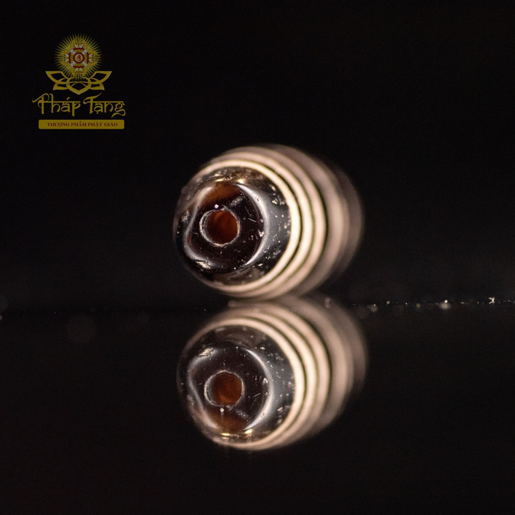 Viên Pum Dzi Cổ Tây Tạng này là một pháp bảo sưu tầm độc bản, một "gia bảo truyền đời" đích thực từ vùng đất Himalaya linh thiêng. Với chiều dài 3cm và dáng trống (barrel shape) kinh điển, pháp bảo này nổi bật bởi chất đá mã não cổ (agate) mang màu nâu sẫm (gần như đen) trầm mặc, tương phản mạnh mẽ với các đường sọc ngang song song màu kem, tựa như những vòng hào quang bảo vệ.