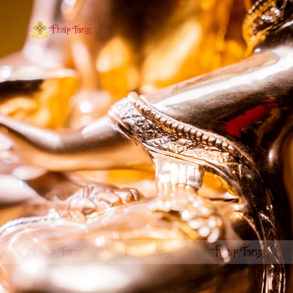 Đây là một pháp bảo thượng phẩm dành cho những đạo hữu hữu duyên thỉnh về tư gia hoặc đạo tràng. Thánh tượng Đức Bổn Sư Thích Ca Mâu Ni, với chiều cao 55cm, được chế tác kỳ công từ đồng nguyên chất và dát vàng 9999 lấp lánh, mang nguồn gốc trực tiếp từ Ấn Độ - cội nguồn của Phật giáo.
