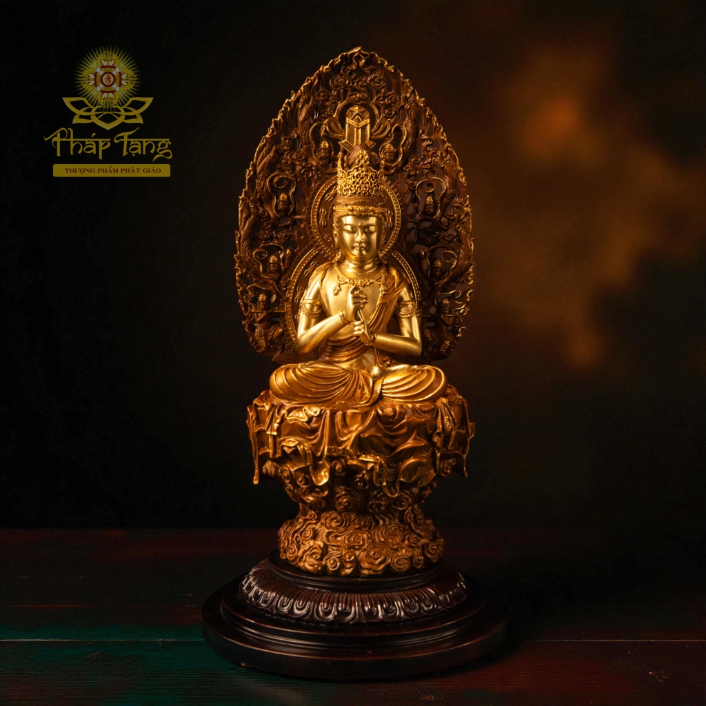 Thánh Tượng Đức Phật Tỳ Lô Giá Na (cao 40cm) là một pháp bảo tối thượng, biểu trưng cho trí tuệ viên mãn và bản thể thanh tịnh của vạn pháp. Ngài chính là Đại Nhật Như Lai (Vairocana), danh hiệu nghĩa là "Quang Minh Biến Chiếu" - ánh sáng trí tuệ vĩ đại chiếu soi khắp vũ trụ, diệt trừ mọi bóng tối vô minh. Được chế tác tinh xảo từ đồng mạ vàng tại Đài Loan, Thánh tượng thể hiện pháp tướng trang nghiêm, là điểm tựa tâm linh cho hành giả trên con đường giác ngộ.