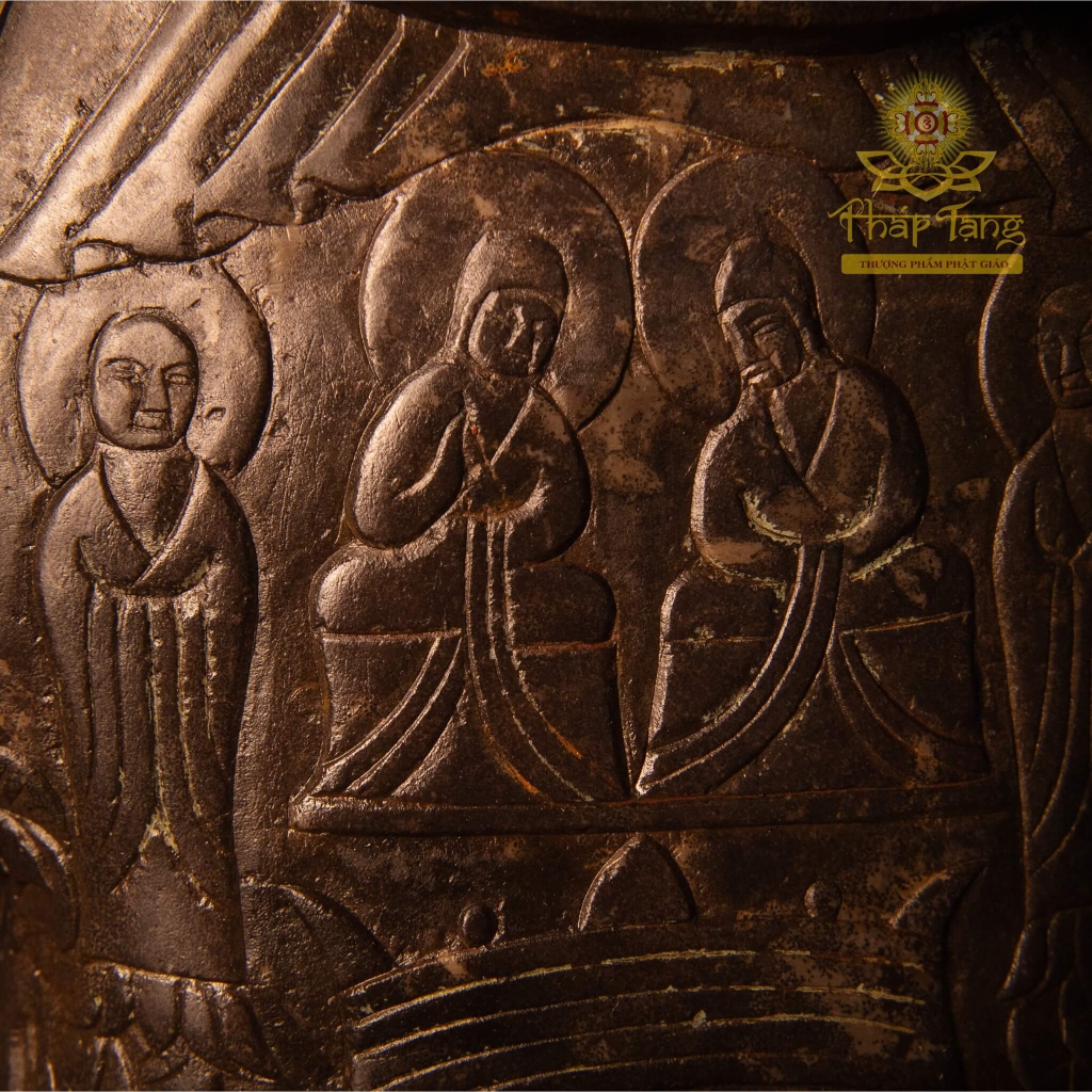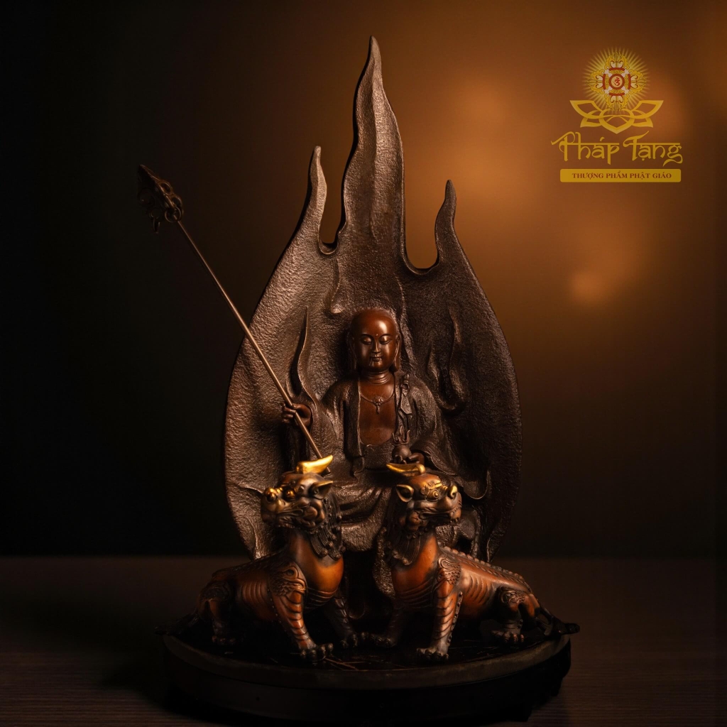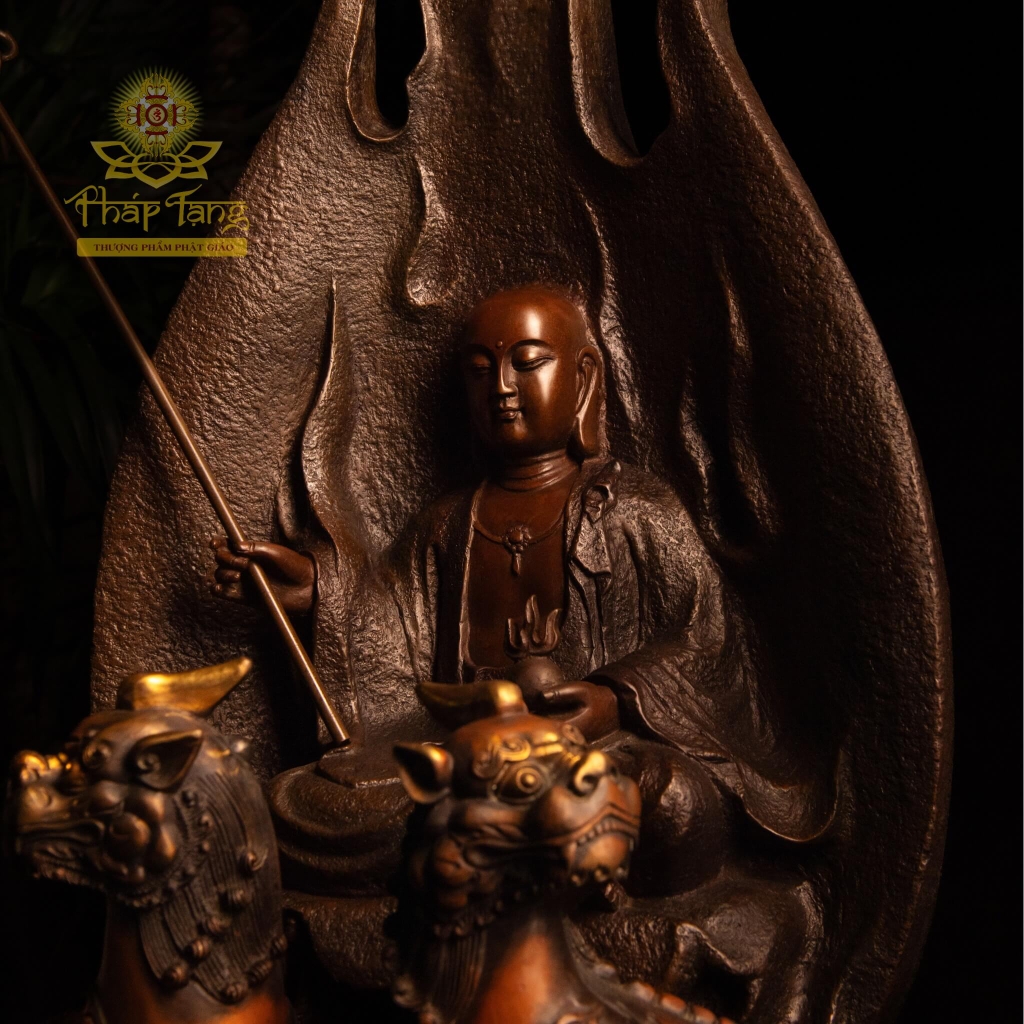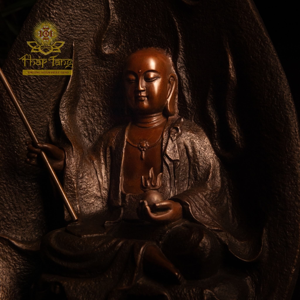 Thánh tượng Bồ Tát Địa Tạng đồng đúc nguyên khối (cao 65cm) là một pháp bảo tâm linh vô cùng quý giá, tái hiện pháp tướng trang nghiêm của vị Bồ Tát có đại nguyện lớn nhất trong Phật giáo Đại Thừa. Ngài là Giáo chủ cõi U Minh, với lời thệ nguyện vĩ đại: "Địa ngục vị không, thệ bất thành Phật. Chúng sinh độ tận, phương chứng Bồ đề". Thờ phụng thánh tượng Ngài tại gia không chỉ thể hiện lòng hiếu kính với tổ tiên, mà còn nương nhờ hạnh nguyện của Ngài để cầu siêu cho vong linh, tiêu trừ nghiệp chướng cho người sống và mang lại sự bình an vô lượng cho gia đạo.