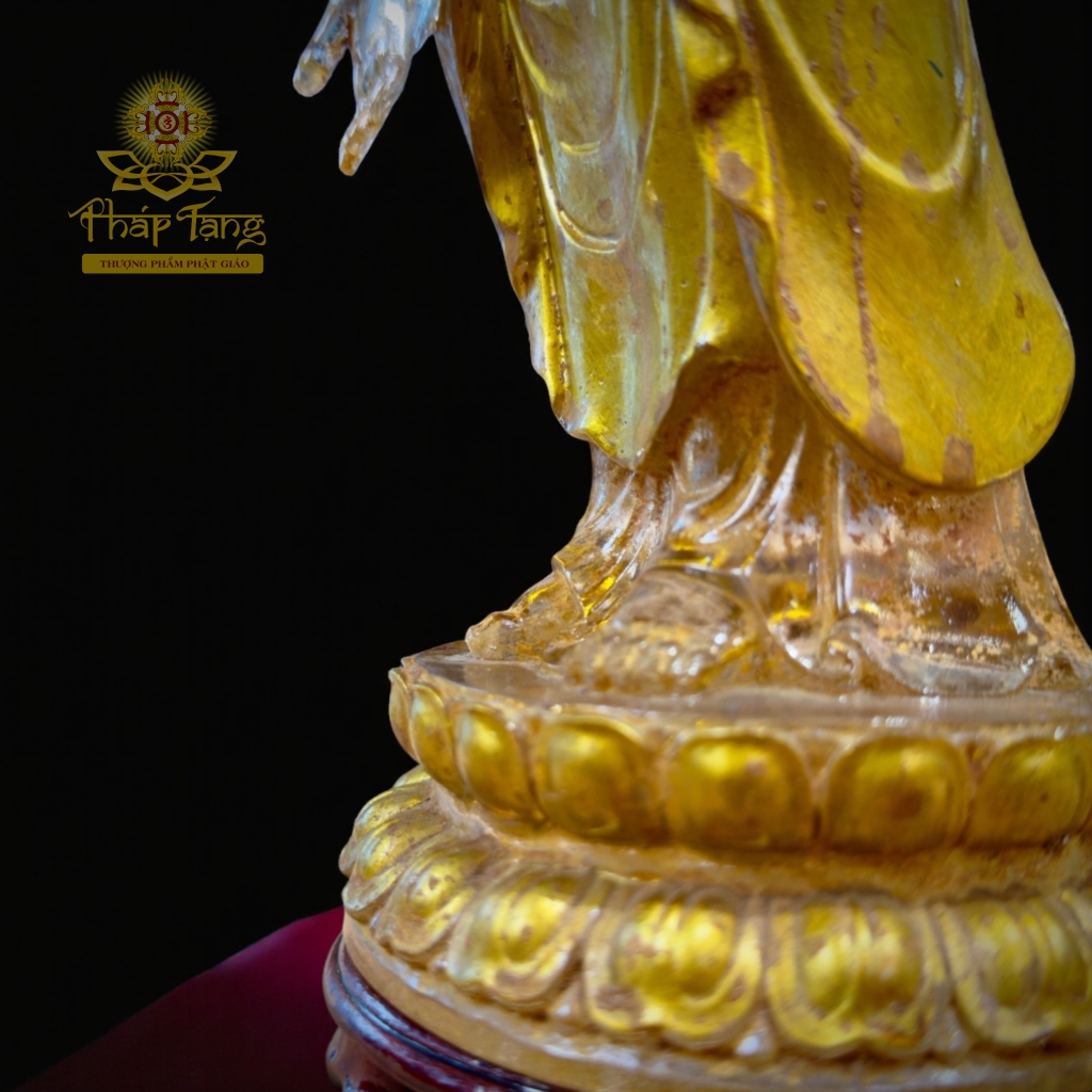 Chất liệu lưu ly vàng trong suốt, thanh tịnh hoàn hảo cộng hưởng với danh xưng Vô Lượng Quang (Ánh Sáng Vô Lượng) của Ngài, tạo nên một tôn tượng không chỉ trang nghiêm về hình tướng mà còn sâu sắc về ý nghĩa, là pháp bảo hộ trì cho hành giả trên con đường tu tập pháp môn Tịnh Độ.