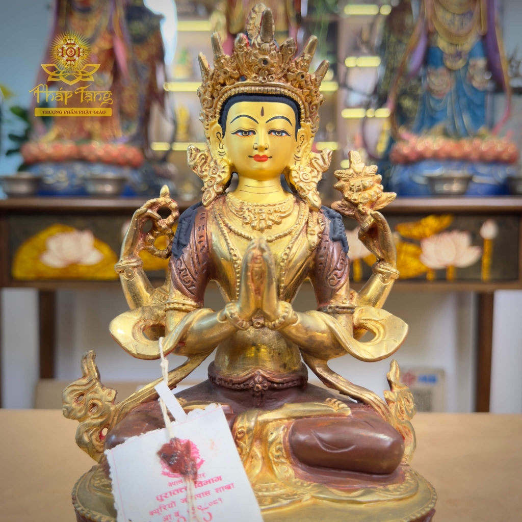 Tôn tượng đồng mạ vàng Nepal cao 23cm được chế tác tinh xảo, nhắc nhở hành giả nuôi dưỡng lòng từ bi, trí tuệ và kỷ luật nội tâm. Thờ phụng Quan Âm Tứ Thủ là thực hành tỉnh thức, phát khởi Bồ đề tâm, đồng thời sống với hạnh nguyện cứu giúp chúng sinh.