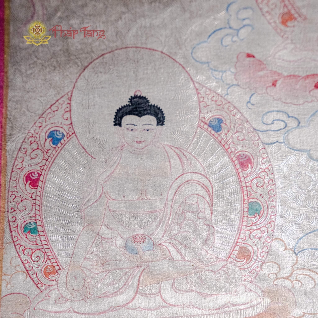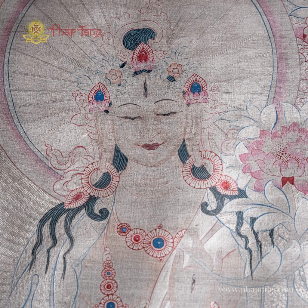 Thangka Đức Tara trắng vẽ tay dát bạc Tu viện Gompa 95x125