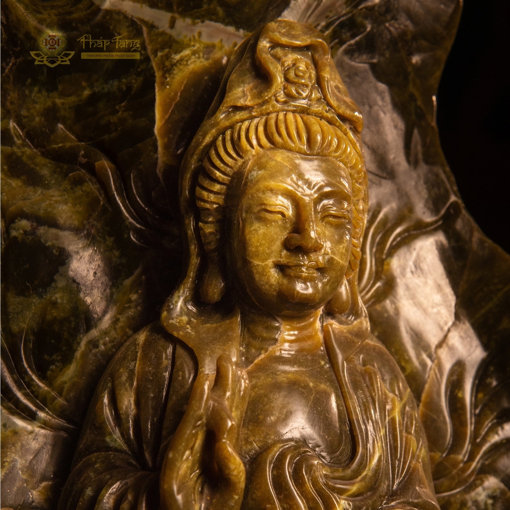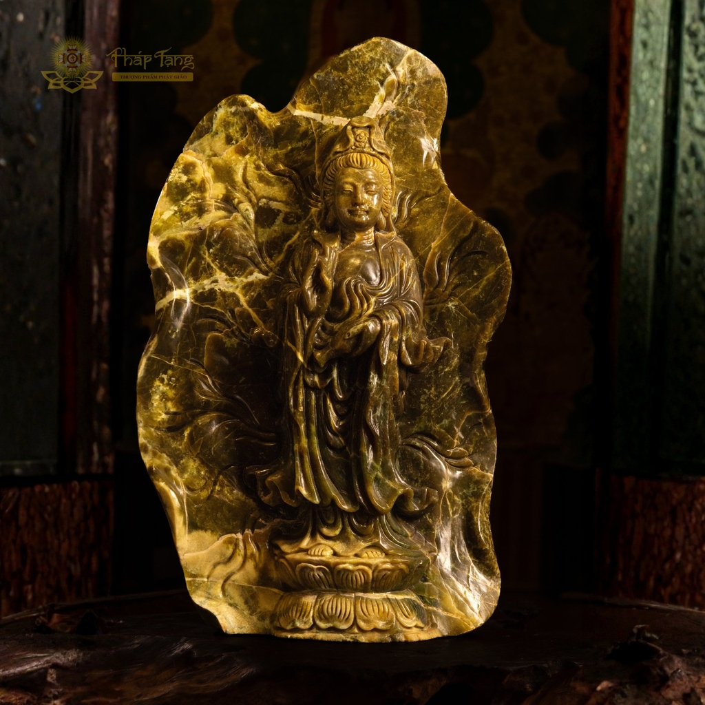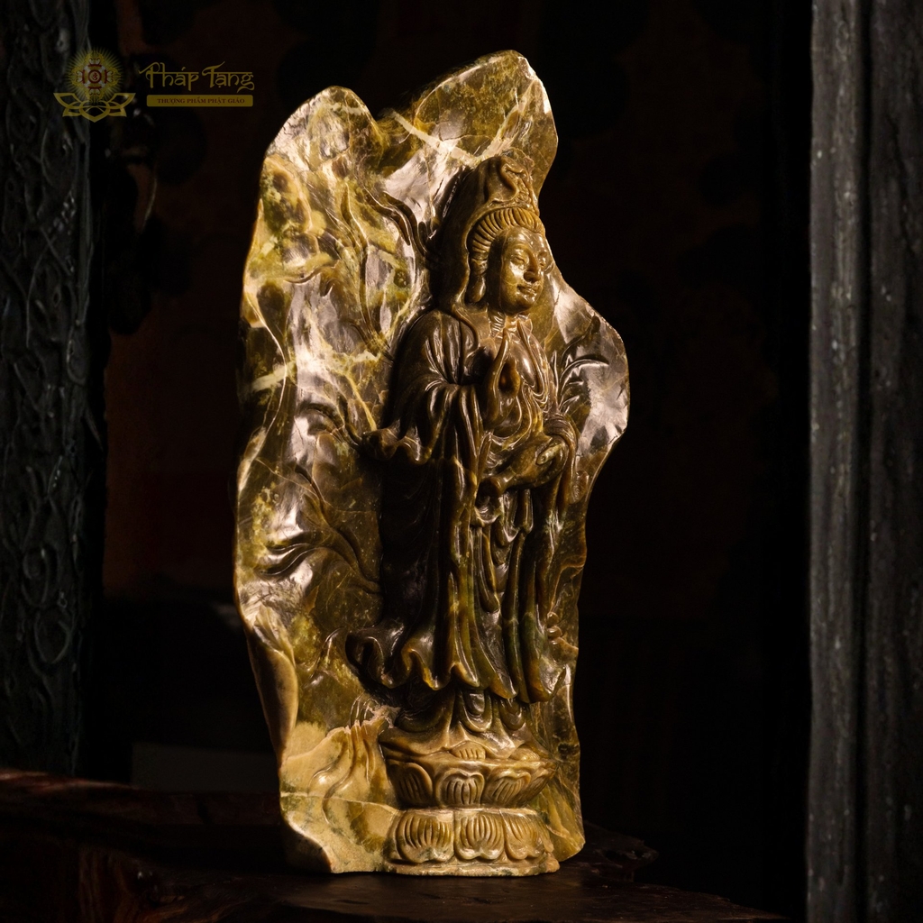 Bồ Tát Quán Thế Âm – biểu tượng của Đại Bi, Đại Từ trong Phật giáo Đại thừa – là vị Bồ Tát được thờ phụng rộng rãi nhất tại Việt Nam và châu Á. Ngài lắng nghe tiếng kêu than của chúng sinh và hoá độ không ngừng nghỉ. Thờ tượng Quán Thế Âm bằng đá tự nhiên mang ý nghĩa cầu bình an, từ bi, hóa giải tai ương – năng lượng của đá tự nhiên được tin là tăng cường linh khí và sự kết nối tâm linh.