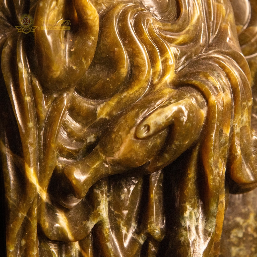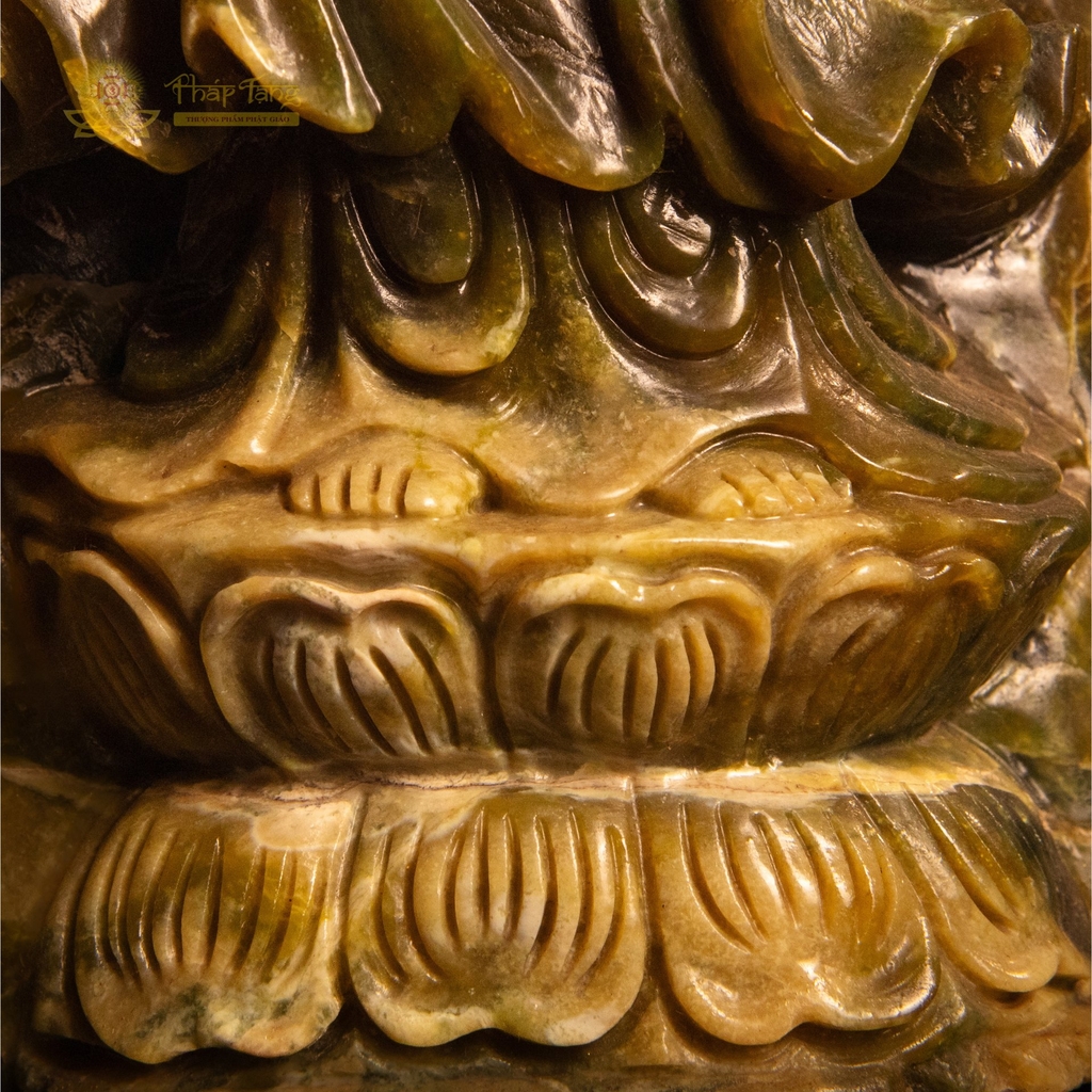 Tôn tượng Đức Bồ Tát Quán Thế Âm cao 55cm, nặng 15kg được tạo tác nguyên khối từ đá Sùng Đô – loại đá quý hiếm bậc nhất Việt Nam, khai thác tại xã Sùng Đô, huyện Bá Thước, tỉnh Thanh Hoá. Mỗi tôn tượng là một tác phẩm sưu tầm độc bản – không thể tái tạo vì vân đá, màu sắc và họa tiết khoáng chất của từng khối đá Sùng Đô đều hoàn toàn khác nhau theo tự nhiên.