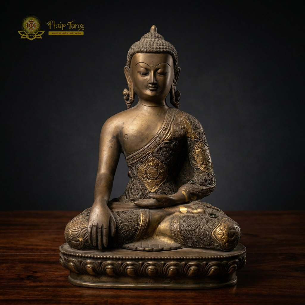 Tôn tượng Đức Bổn Sư Thích Ca Mâu Ni bằng đồng Ấn Độ cổ cao 30cm – một tác phẩm sưu tầm độc bản mang phong cách nghệ thuật Pala Ấn Độ (thế kỷ 8–12). Tượng thể hiện khoảnh khắc thiêng liêng Đức Phật thành đạo dưới cội Bồ Đề qua ấn xúc địa (Bhumisparsha mudra): tay phải chạm đất làm chứng nhân, tay trái an định trên lòng.