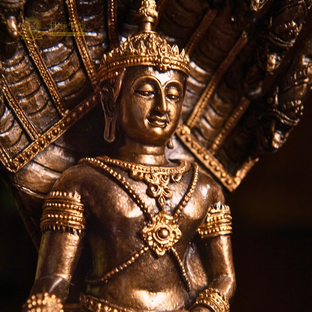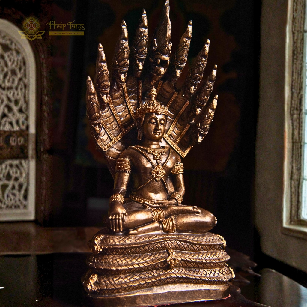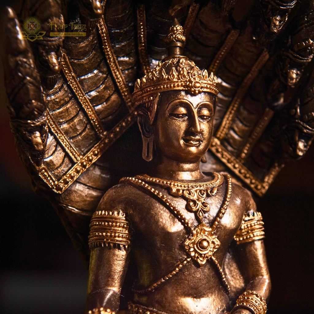 Tôn tượng Đức Bổn Sư Thích Ca Mâu Ni bằng đồng cao 31cm tái hiện huyền tích thiêng liêng Naga Muchalinda: Rắn thần Naga vương cuộn thân bảo hộ, xoè bảy đầu phủ bóng che mưa bão cho Đức Phật ngồi thiền định sau khoảnh khắc giác ngộ tại Bodh Gaya. Đây là tượng sưu tầm đồng cổ với phong cách nghệ thuật Phật giáo Đông Nam Á – Khmer, độc bản, vô song.