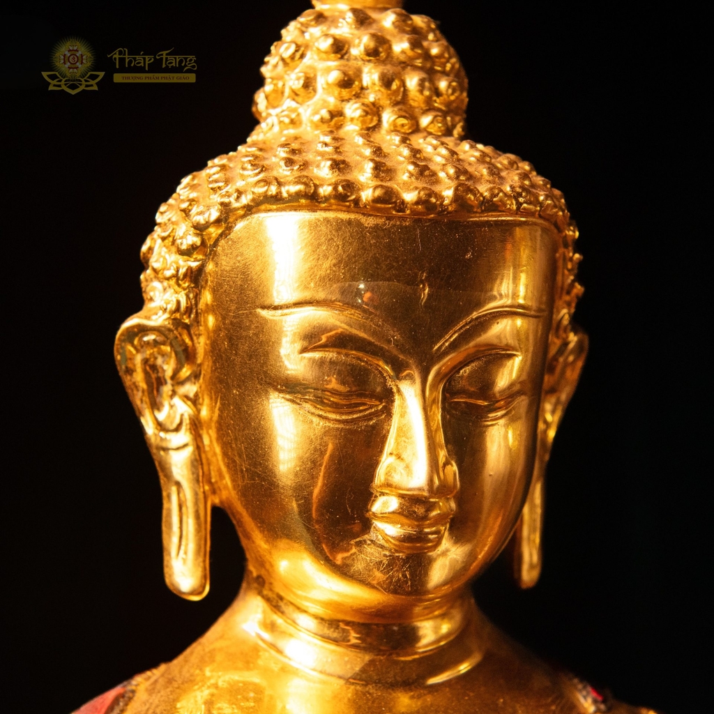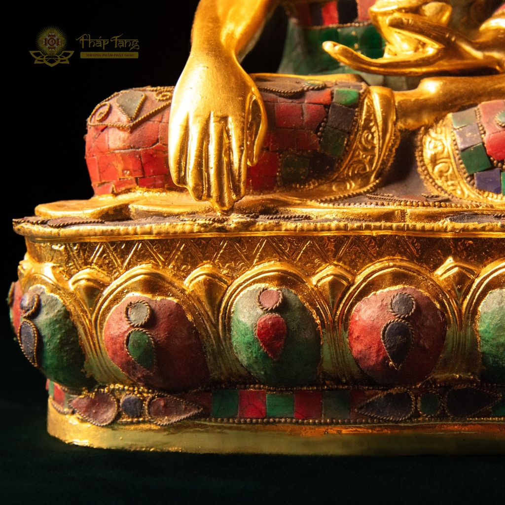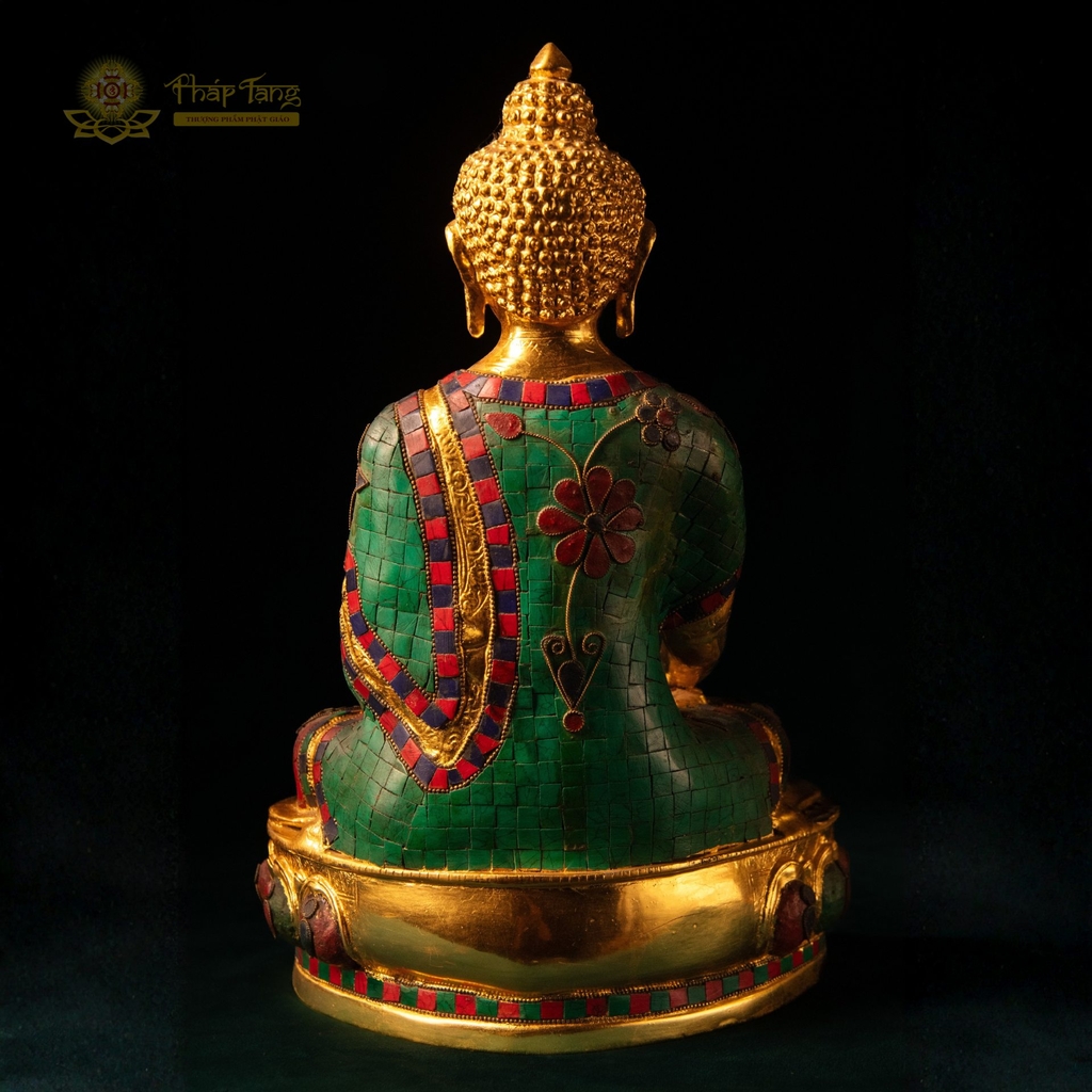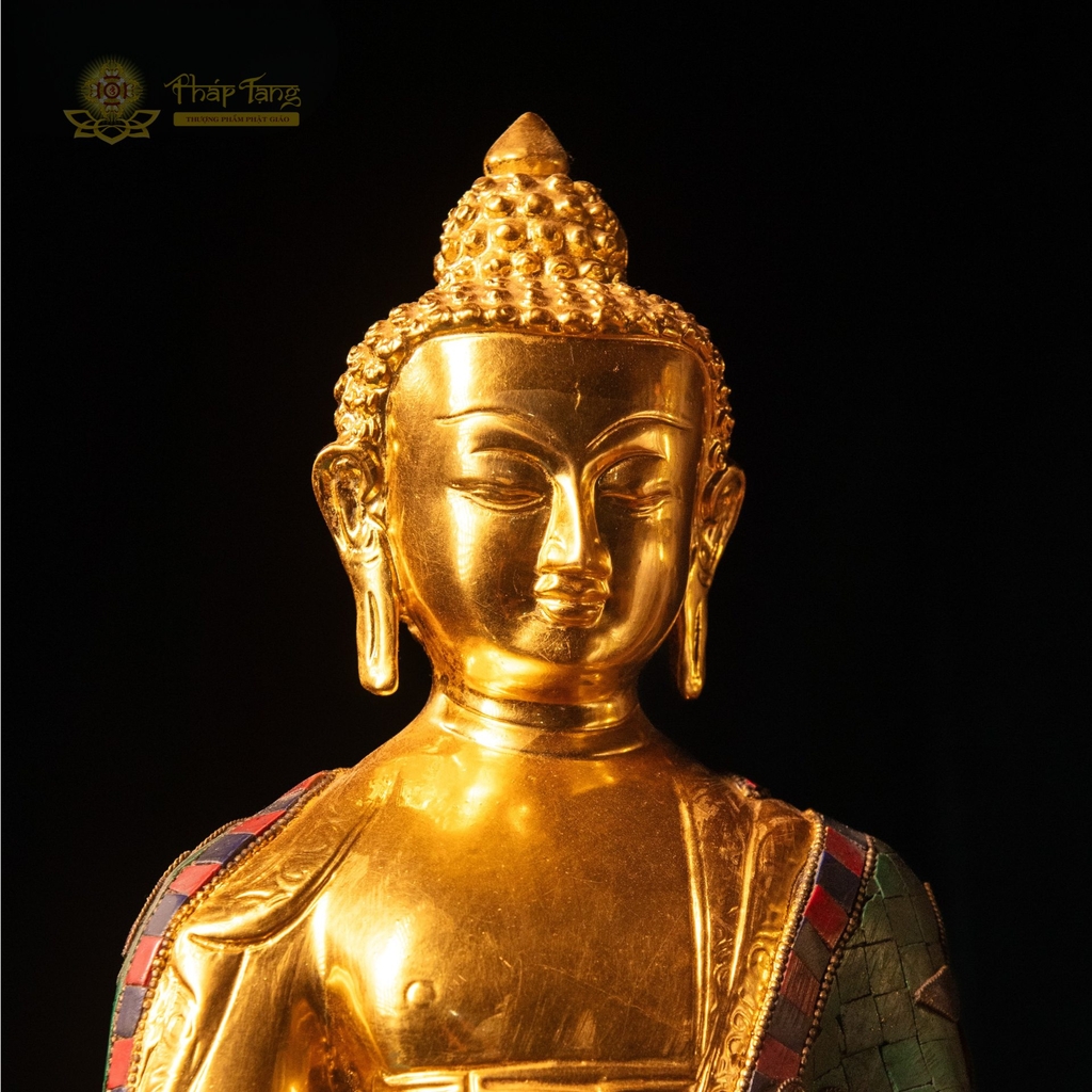 Tôn tượng Đức Bổn Sư Thích Ca Mâu Ni bằng đồng nguyên khối mạ vàng 24k cao 40cm, nặng 8.6kg – một kiệt tác sưu tầm kết hợp giữa kỹ thuật đúc đồng tinh xảo và nghệ thuật khảm đá xanh linh thiêng. Bề mặt phủ vàng 24k thuần khiết, điểm xuyết đá xanh tự nhiên tại các vị trí đặc biệt trên pháp y và đài sen – tạo nên vẻ huy hoàng, rực rỡ xứng tầm pháp bảo thượng phẩm.