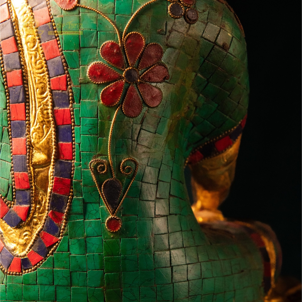 Đá xanh – đặc biệt là Lapis Lazuli và Turquoise – có vị trí linh thiêng đặc biệt trong Phật giáo Tây Tạng và Mật tông. Lapis Lazuli là màu của bầu trời giác ngộ, gắn liền với Đức Phật Dược Sư – biểu tượng của sự chữa lành, trừ bệnh và tiêu tai. Khi kết hợp trên tôn tượng Đức Bổn Sư Thích Ca, đá xanh tăng cường năng lượng thanh tịnh, hộ trì sức khoẻ và khai mở trí tuệ cho gia chủ thờ phụng.