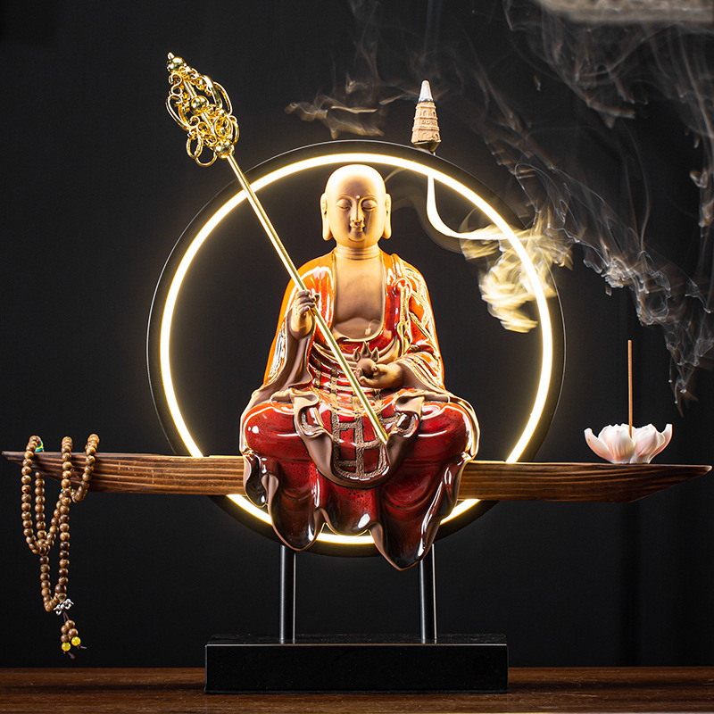 Tượng Đức Địa Tạng Vương gốm tử sa (bộ gồm kệ đèn)