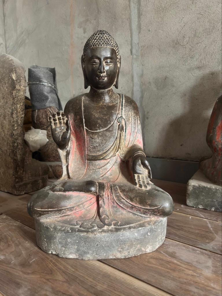 Tôn tượng đồ xưa với tàn tích sơn đỏ phong hóa và thủ ấn Vô Úy mang năng lượng chở che