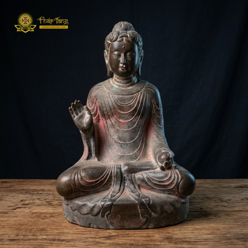 A: Đây là tác phẩm sưu tầm có dấu ấn thời gian, độ tuổi cụ thể cần thẩm định trực tiếp. Tượng mang giá trị văn hóa và nghệ thuật Phật giáo truyền thống.