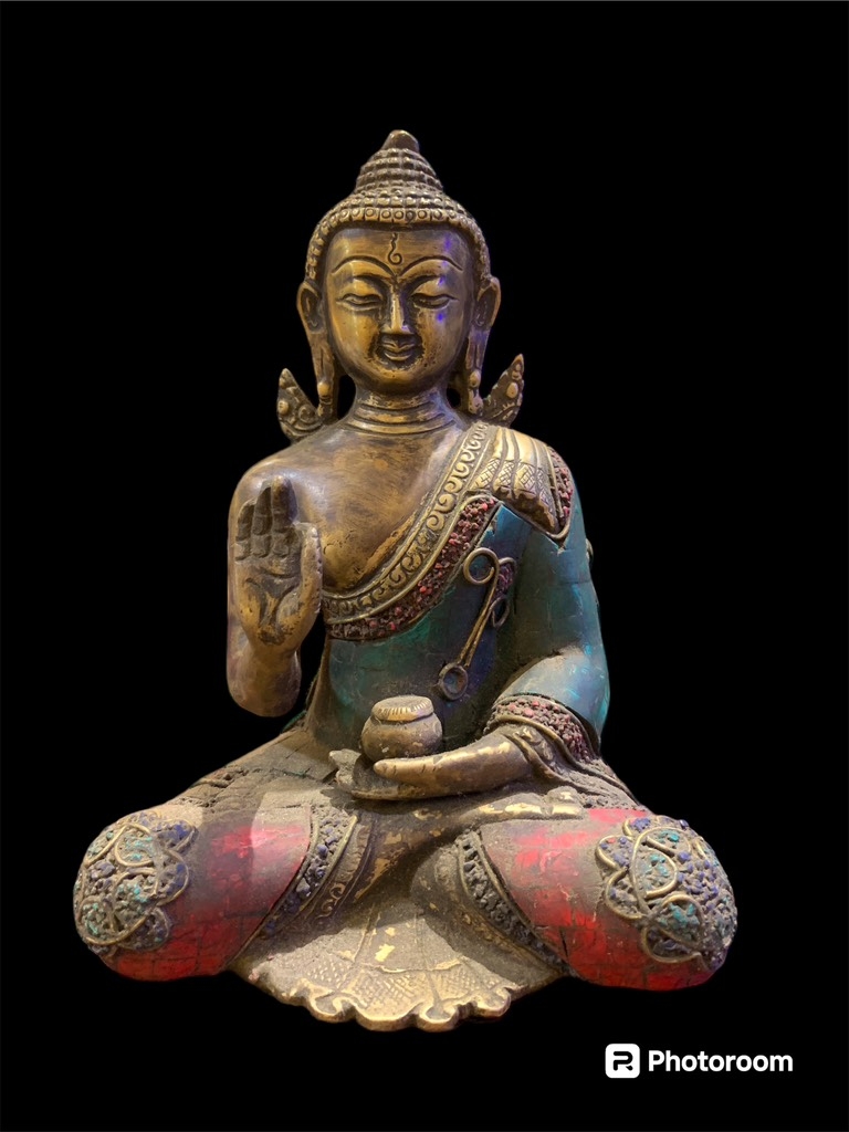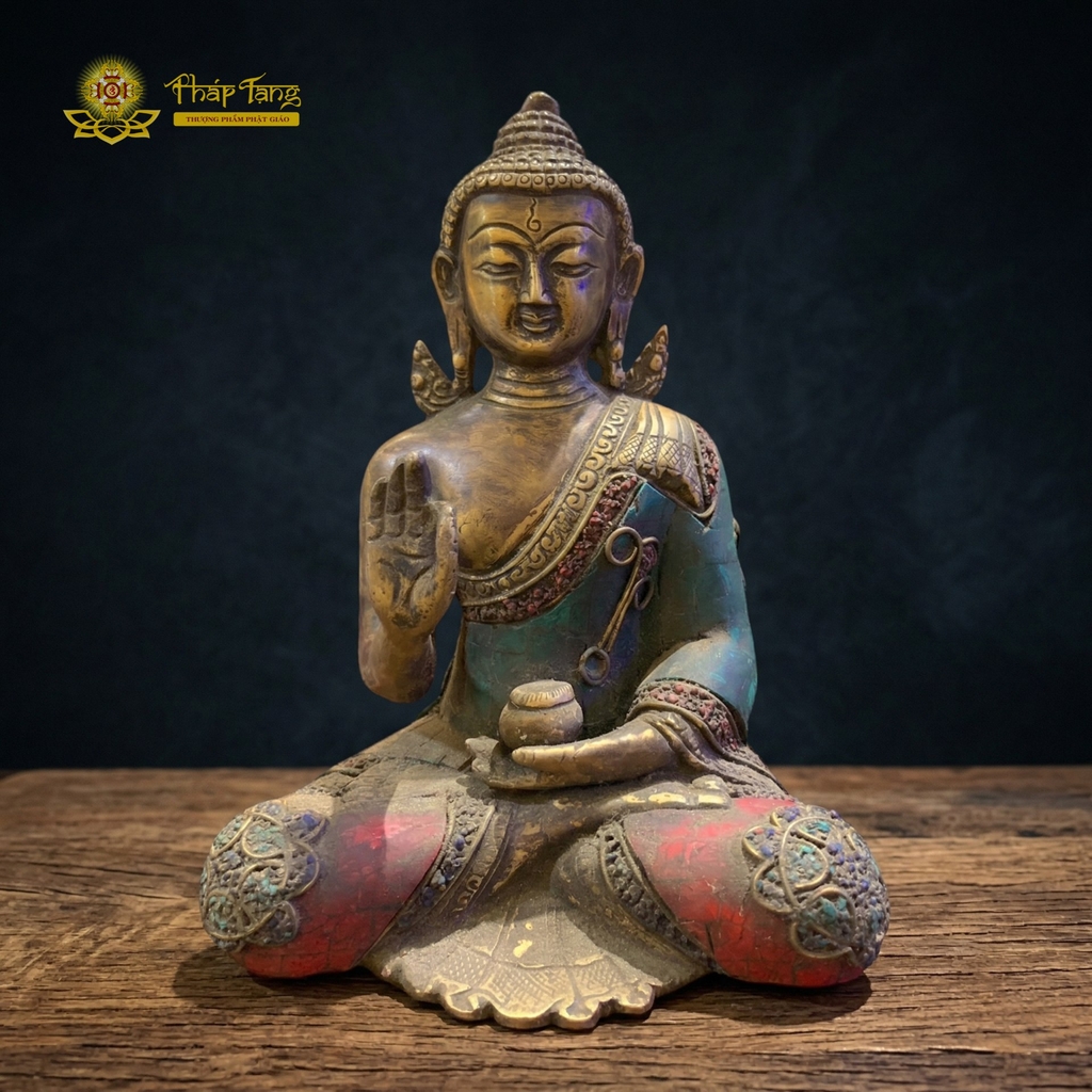 Bức tượng Phật Thích Ca đồng khảm đá quý 20.5cm là một tác phẩm nghệ thuật tâm linh mang đậm dấu ấn của phong cách Mật Tông (Kim Cương Thừa). Sự kết hợp hoàn hảo giữa kỹ thuật đúc đồng thủ công và nghệ thuật khảm đá màu truyền thống đã tạo nên một tôn tượng không chỉ trang nghiêm mà còn tỏa ra trường năng lượng vô cùng rực rỡ.