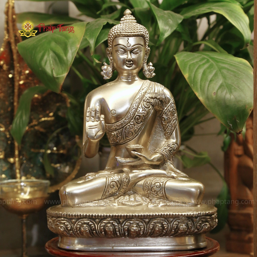 Tôn tượng Đức Bổn Sư Thích Ca Mâu Ni bằng đồng mạ bạc cao 22cm – thể hiện Ngài trong tư thế Thuyết Pháp (Vitarka mudra): tay phải giơ lên ban truyền Pháp, ngón cái và ngón trỏ chạm nhau tạo vòng tròn Pháp luân; tay trái thư thái nâng bình bát Cam Lồ – biểu tượng nuôi dưỡng chúng sinh bằng cam lộ Phật pháp. Lớp mạ bạc thuần khiết toàn thân tạo ánh bạc lạnh, huyền ảo – đặc trưng thẩm mỹ Mật Tông Ấn Độ hiếm gặp.