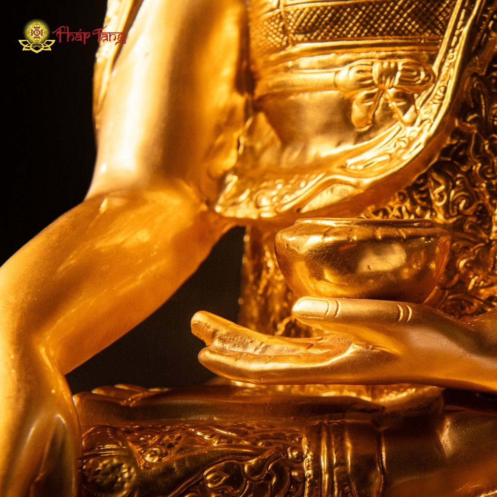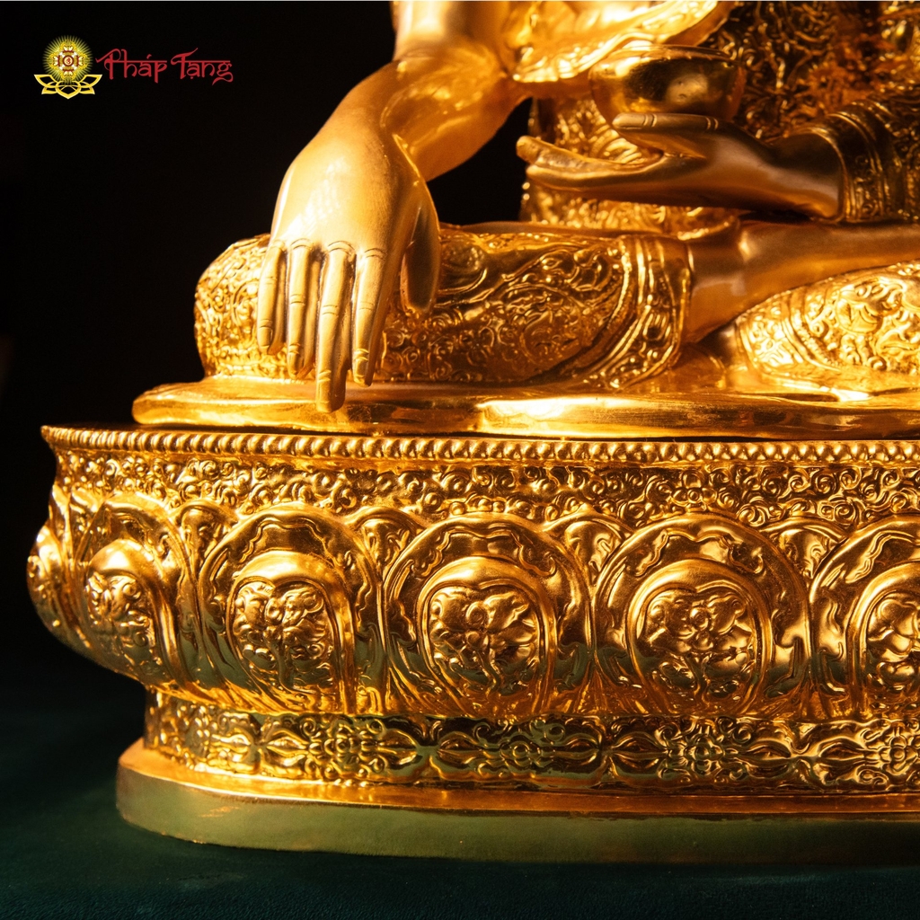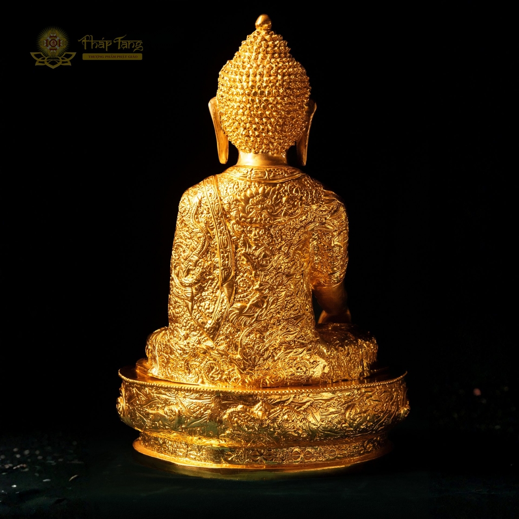 Tôn tượng Đức Bổn Sư Thích Ca Mâu Ni bằng đồng nguyên khối mạ vàng 24k – kích thước 60x37x26cm, nặng 20kg – là kiệt tác sưu tầm đỉnh cao, kết hợp giữa kỹ thuật đúc đồng tinh xảo và hoa văn Mật Tông đặc biệt phủ toàn thân tôn tượng. Bề mặt phủ vàng 24k thuần khiết, từng đường hoa văn được chạm khắc thủ công tỉ mỉ – xứng tầm đại tượng chính điện chùa chiền và ban thờ cao cấp.