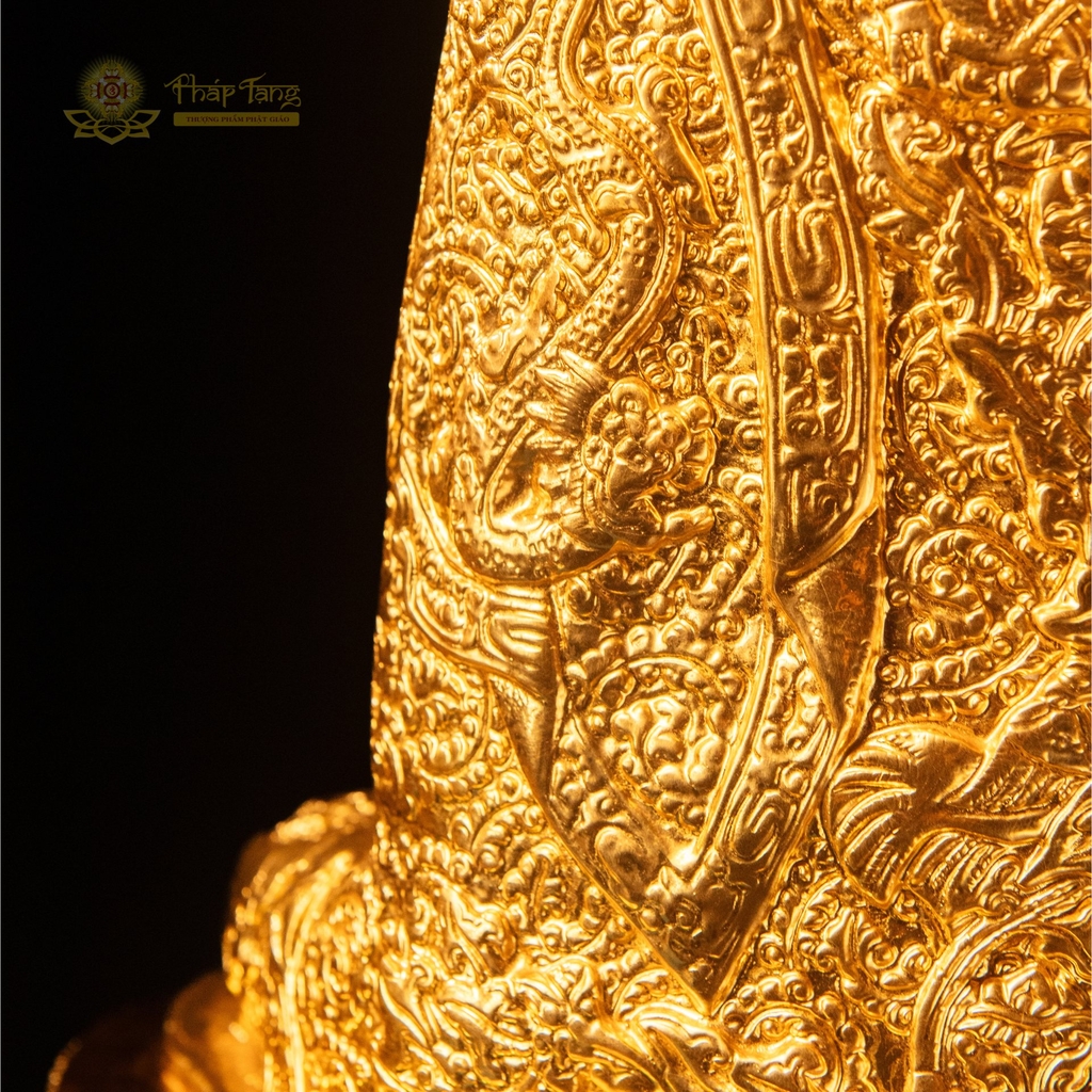 Với kích thước 60cm và trọng lượng 20kg, tôn tượng này thuộc phân khúc đại tượng – thường được thỉnh về để thờ tại chính điện chùa, tịnh thất, thiền đường hoặc ban thờ trang trọng của những gia đình Phật tử tín tâm. Sự kết hợp giữa đồng nguyên khối và mạ vàng 24k tạo nên vầng hào quang rực rỡ, lan toả năng lượng linh thiêng trong không gian thờ phụng.