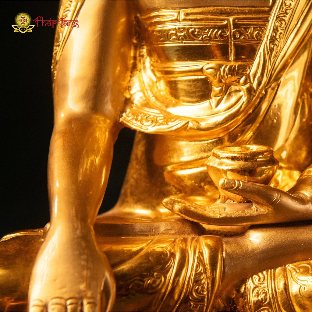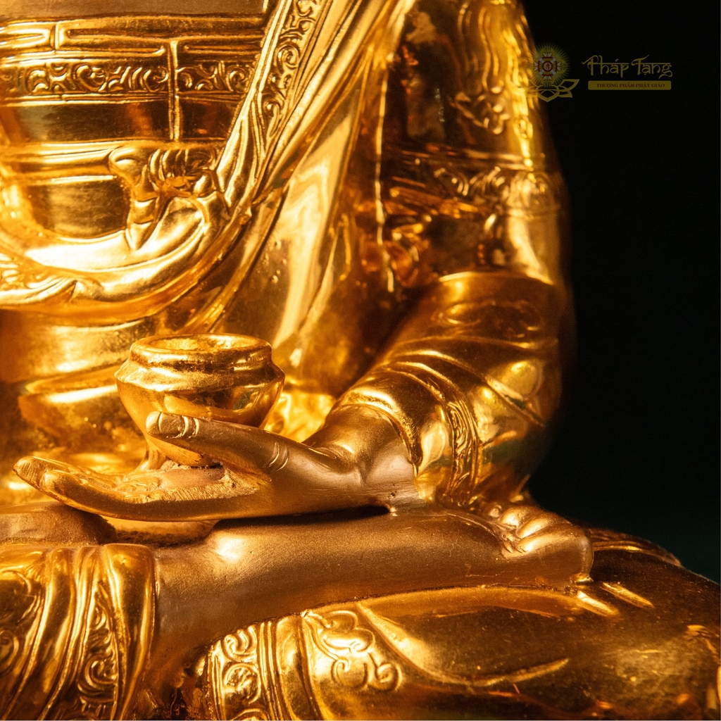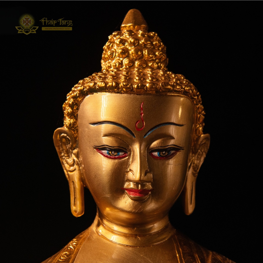 Tôn tượng Đức Bổn Sư Thích Ca Mâu Ni mạ vàng xuất xứ Ấn Độ cao 36cm – chế tác thủ công theo truyền thống nghệ thuật Phật giáo Mật Tông Ấn Độ, kế thừa kỹ thuật mạ vàng cổ xưa của các nghệ nhân vùng Bihar – Bodh Gaya. Mỗi đường nét pháp y, từng nếp áo cà sa và thần thái Đức Phật được thể hiện với độ tinh xảo cao, tạo nên vẻ trang nghiêm, linh thiêng đặc trưng của dòng tượng Phật giáo Ấn Độ chính thống.