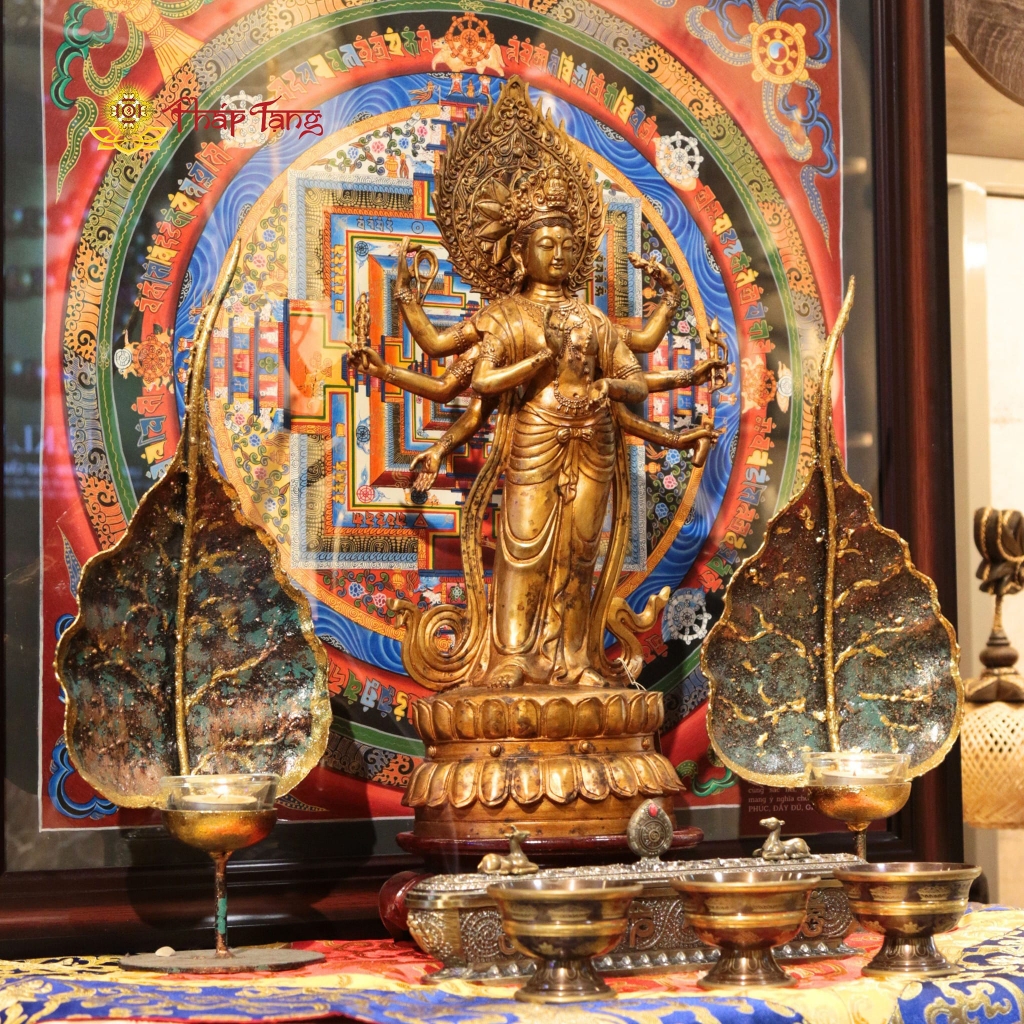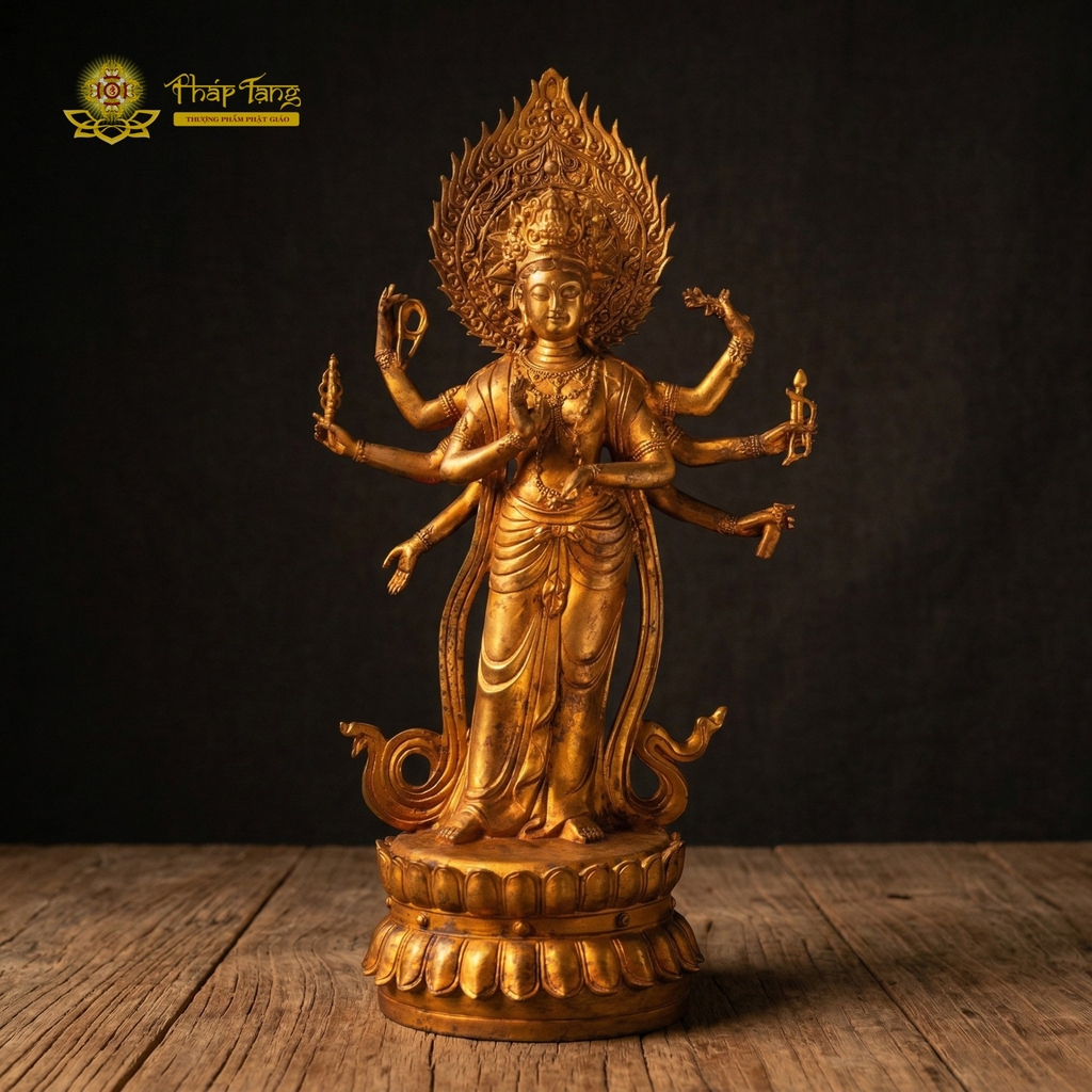 Điểm nhấn quyền năng nhất của tôn tượng nằm ở tạo hình 8 cánh tay vươn ra các hướng vô cùng cân xứng và nội lực. Mỗi cánh tay trì giữ một pháp khí đặc trưng (như hoa sen, pháp khí hàng ma, chày kim cang...), biểu trưng cho muôn vàn phương tiện mà Đức Bồ Tát dùng để cứu vớt chúng sinh khỏi biển khổ luân hồi. Phía sau lưng Ngài là vầng hào quang rực lửa vươn cao, tượng trưng cho ánh sáng trí tuệ mãnh liệt thiêu rụi mọi vô minh, xua tan những trường khí tiêu cực trong không gian thờ phụng.