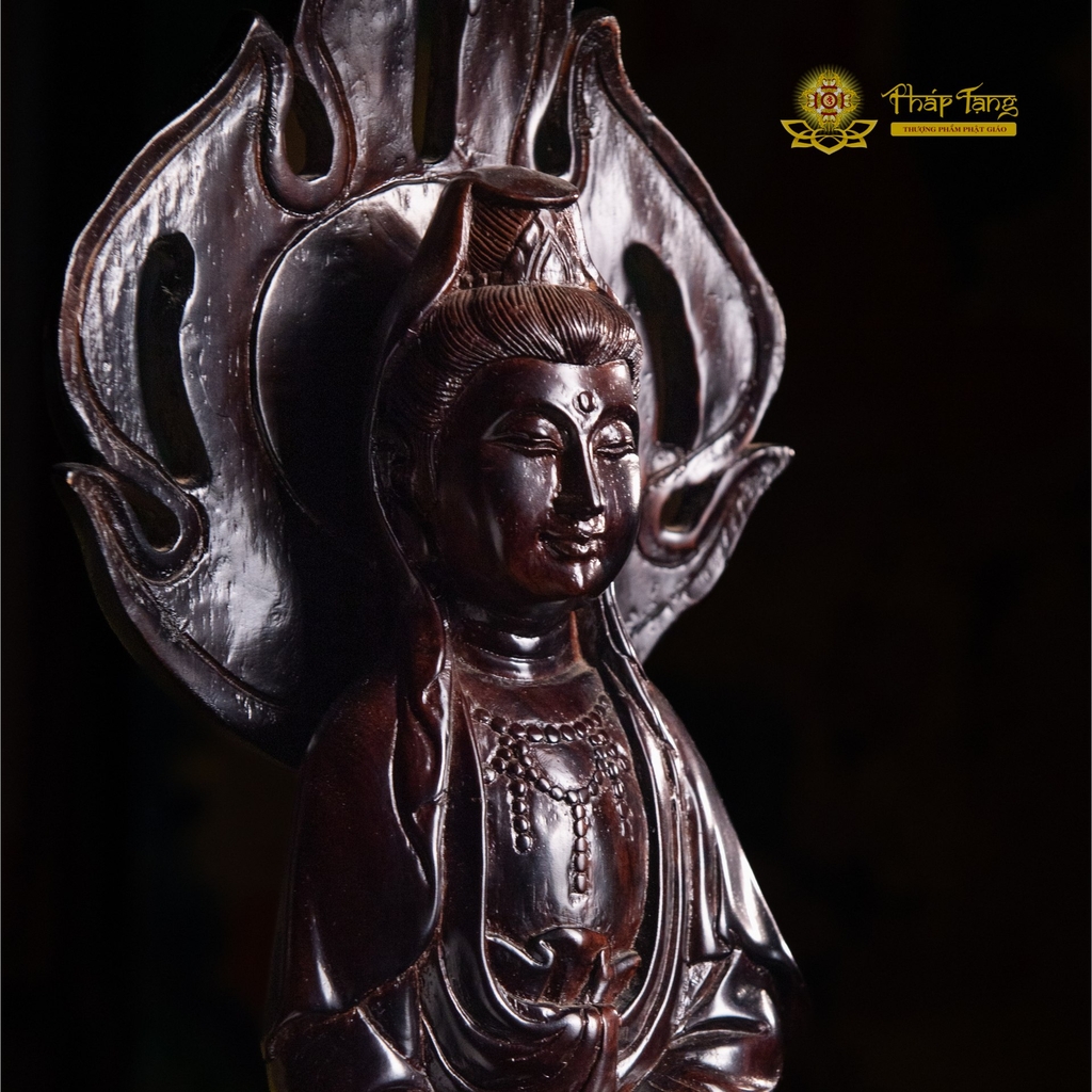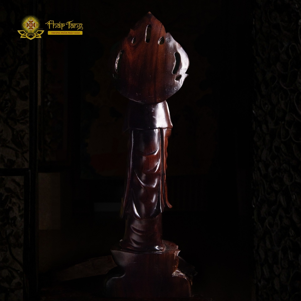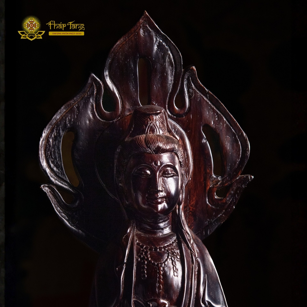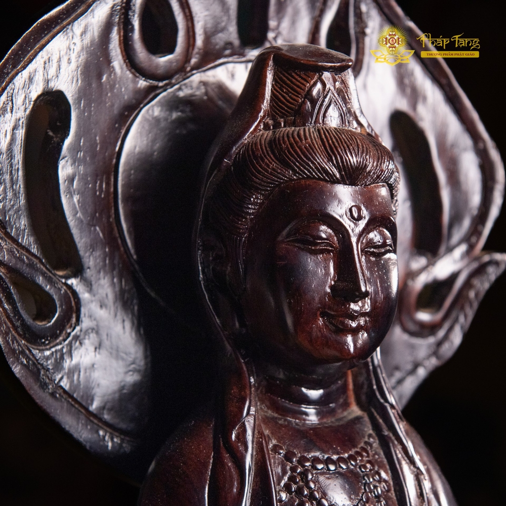 Tôn tượng được chế tác từ dòng gỗ quý của Myanmar, nổi tiếng với độ bền cao, thớ gỗ mịn và khả năng chống mối mọt tuyệt vời. Điểm khiến người thưởng ngoạn phải trầm trồ chính là kỹ thuật đục đẽo của nghệ nhân. Bức tượng khắc họa Mẹ Quan Âm trong dáng đứng trên đài sen, nếp y áo bay bổng, uyển chuyển như đang lướt trong gió. Phía sau lưng Ngài là vầng hào quang hình lá đề (hay ngọn lửa trí tuệ) được trạm trổ sắc nét, ôm trọn lấy diện mạo từ bi, tạo nên một tổng thể vô cùng thoát tục và thiêng liêng.